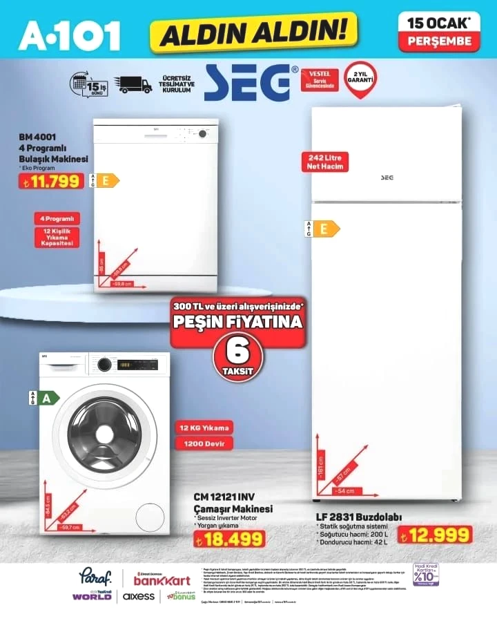 Evini yenileyenler veya çeyiz dizenler için beyaz eşya grubunda SEG markalı ürünler öne çıkıyor. 4 programlı bulaşık makinesi 11 bin 799 lira, çamaşır makinesi ise 18 bin 499 liradan satışa sunulacak.