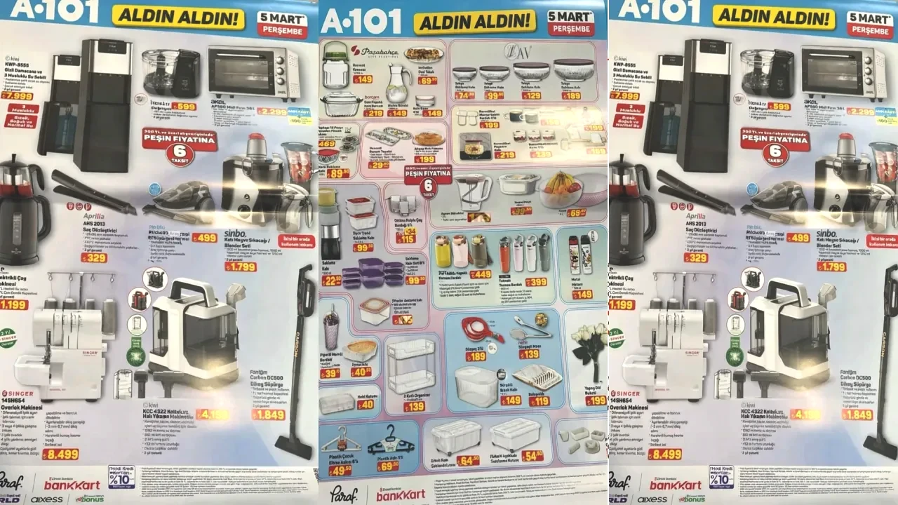 A101 Aldın Aldın bu hafta ürünleri ve yeni afiş fiyat listesi tüketicilerle paylaşıldı. 5 Mart 2026 A101 aktüel ürünleri kataloğu ile bu hafta Perşembe ürünleri tek tek listelendi. A101 indirim broşürü en yeni ürünler arasında overlok makinesi 8.499 TL, koltuk ve halı yıkama makinesi 4.199 TL, katı meyve sıkacağı blender seti 1.799 TL, araç tipi el süpürgesi 499 TL, 5 kapaklı fırın bölmeli çok amaçlı dolap 2.999 TL ile market raflarında yerini alacak. A101 Aldın Aldın kataloğu, her hafta alışveriş severler geniş yelpazede ürün seçenekleri sunuyor. Peki A101 aktüel ürünler kataloğu bu hafta indirimli neler var? İşte 5 Mart 2026 A101 afişi yeni ürünleri tam sıralı listesi...