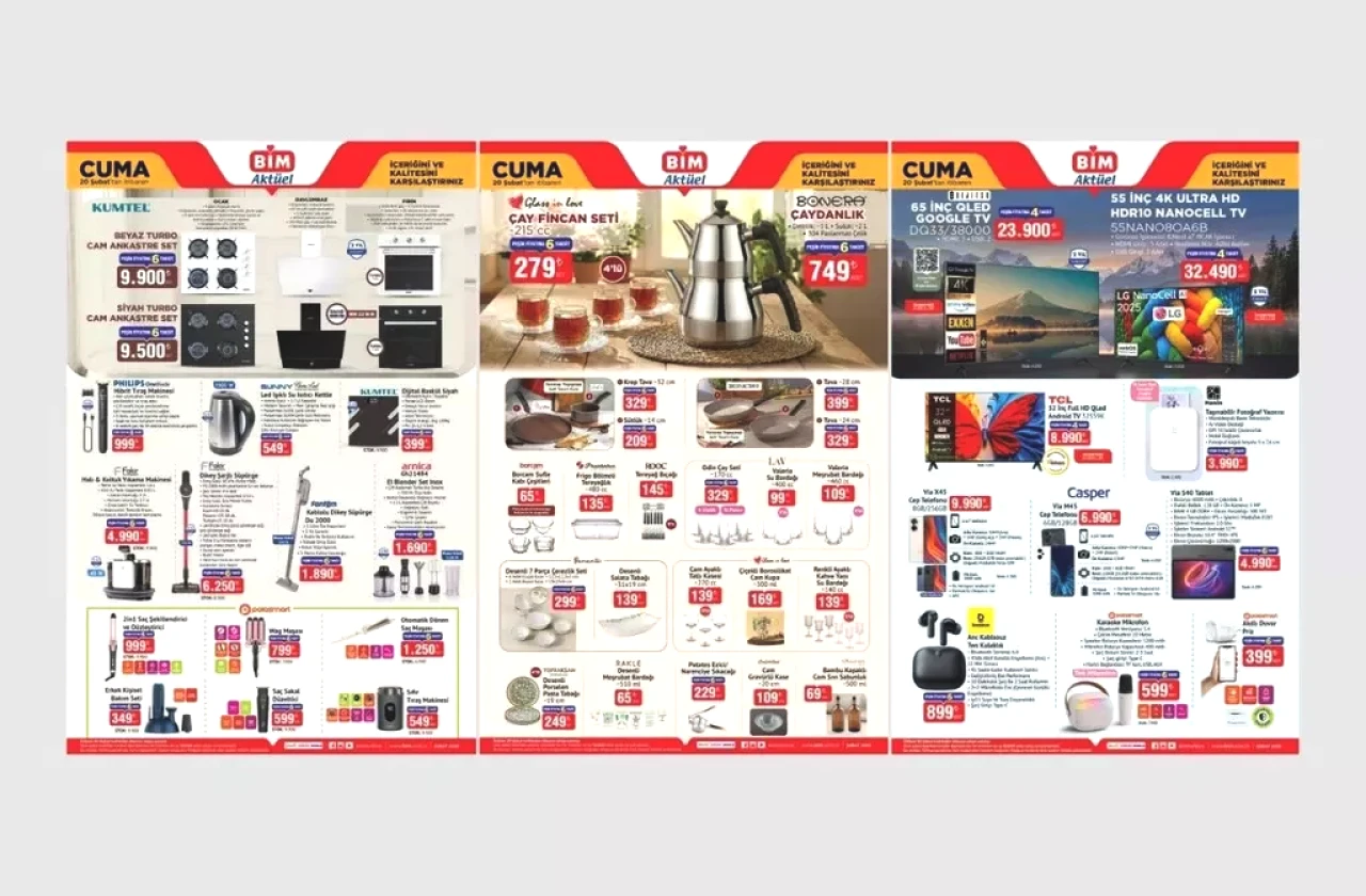 BİM 20 Şubat aktüel kataloğunda bu hafta teknoloji ve ev ihtiyaçları ön plana çıkıyor. Özellikle LG 4K Nanocell TV ve TCL QLED televizyonlar, uygun fiyatlı dev ekran arayanlar için en dikkat çeken ürünler arasında. Mutfakta Kumtel ankastre setler ve Bonera çelik çaydanlıklar şıklık vadederken kişisel bakımda Philips OneBlade tıraş makinesi ve Fakir dikey şarjlı süpürge teknolojik konfor sunuyor. Ayrıca Casper akıllı telefonlar, Baseus kulaklıklar ve Polosmart’ın saç şekillendirme ürünleri, uygun bütçeyle ihtiyaçlarını yenilemek isteyenler için bu cuma BİM'de!
