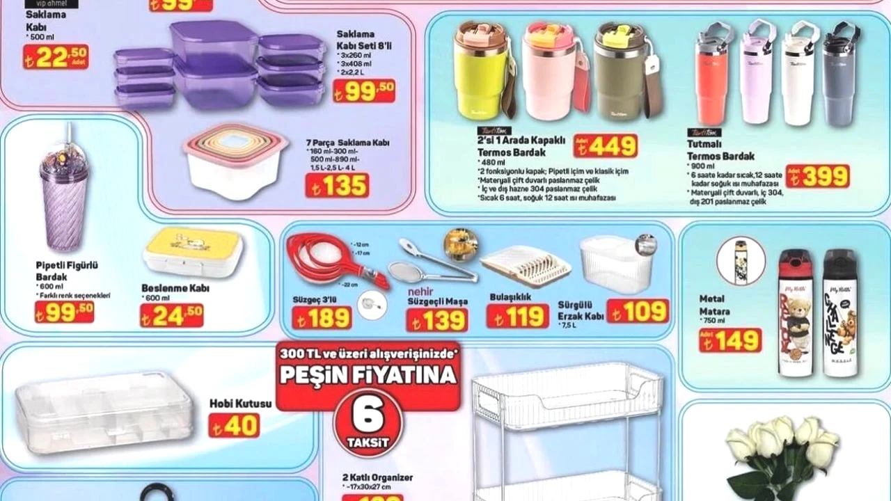 Türkiye’nin dört bir yanında hizmet veren A101, 5 Mart Perşembe tarihli “Aldın Aldın” aktüel kataloğuyla yine dikkatleri üzerine çekti. Bu hafta özellikle mutfak ürünleri, saklama çözümleri ve termos çeşitleri öne çıkıyor.