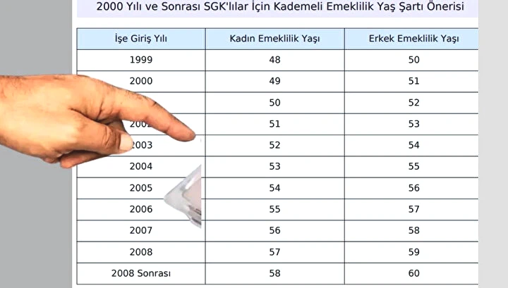 2000-2008 yılları arasında SGK, Bağ-Kur ve Emekli Sandığı'na kayıtlı olanlar için yeni bir düzenleme gündeme geldi. 1999 SGK girişli olup EYT kapsamında olamayan sigortalılar için belirlenen kademeli yaş şartları, işe giriş tarihlerine göre değişiklik gösteriyor. 2000-2008 yılları arasında Sosyal Güvenlik Kurumu (SGK) girişleri olanlar, Türkiye'de sosyal güvenlik sisteminde belirli değişikliklerden etkilenmişlerdir. Bu dönem, Türkiye'nin sosyal güvenlik sisteminde reformların gerçekleştirildiği bir dönemi kapsar. 2000-2008 arası 44-45 48 49 50 51 yaş şartı önerisi geldi. 1999 sonrası kademeli emeklilik çıkacak mı? Peki 2000 sonrasına emeklilik var mı? Kademeli emeklilik gelecek mi, 1999 ve 2008 arası sigortalı olanlara kademeli erken emeklilik torba yasada var mı? İşte 2000-2008 arası SGK girişi olanlar için kademeli erken emeklilik tablosu: